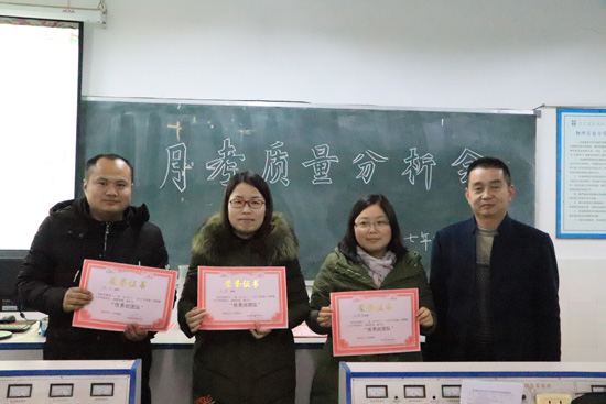 接着,年级部对本次考试中表现突出的团队进行了表彰。七(1)班、七(6)班、七(8)班、七(12)班、七(16)班班团队被评为“优秀班团队”;七年级语文组荣获了“优秀备课组”。朱校长现场给优秀团队颁奖。获奖的老师们站在台上个个脸上都带着惊喜的微笑,为身在优秀的团队而深感自豪。