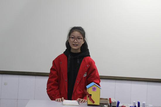 八(15)班郭佳倩、郭佳丽是一对热爱音乐的姐妹花,在家听歌时总觉得的手机音量太小,买一个音响又太贵了,所以她们决定一起制作一个立体扩音器。这个小制作只用了生活中很常见的一次性纸杯,利用了传统的物体传声的原理制作而成,但是鉴于传统的物体传声声音会分散,所以设置成了双音通道,从而使声音产生立体声,以减少声音的分散,从而使传声效果更好。同学们听后大呼简单,叫喊着:“这次大休回家也要做一个试试!”