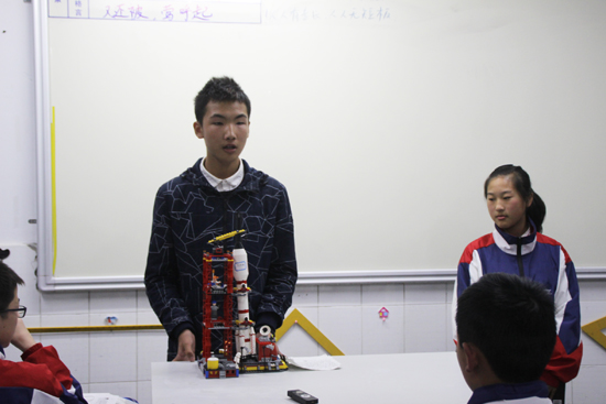 八(14)班徐旭阳同学手捧航天模型自豪地向七年级的学生介绍:“我一直怀揣着航天梦,我们科技小组五个人历时一个星期终于把模型拼出来了,这个艰难的过程让我们明白,一个航天模型都如此不容易,我们国家的航天英雄们得付出多少汗水才造就了我们祖国伟大的航天事业,我要像他们一样努力学习为国家的航天事业做贡献。”同学们纷纷竖起大拇指为学长点赞。