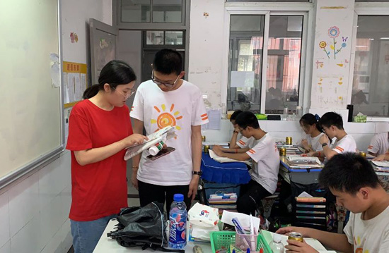 考前,所有九年级老师们都身着红色T恤,来到孩子们自习的教室,给孩子们加油打气,细细叮嘱考试中的注意事项。戴杨阳老师准备了一杆秤和一块绑在一起的糕和粽子,让每个孩子们出门前,轻轻一跳,用头顶一下,寓意“秤”心如意,一顶“糕粽”。陈飞老师们给每个孩子准备了温馨有爱的“爱心贴”,将考试注意事项印在爱心贴上,再请各个科任老师贴在孩子们的胸前,提醒孩子们时时牢记。七(15)班的朱峰老师还组织学生们手写祝福语,录制微视频,给学哥学姐们加油打气。