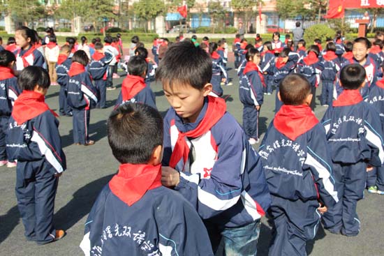 入队仪式由少先队大队委员主持。首先由大队长宣读一年级新少先队员名单,由大队辅导员宣读一年级中队辅导员名单,小学部校长吴迪兴、德育处主任董静为五位中队辅导员授红领巾及中队旗。接着,由优秀少先队员代表为296名新队员佩戴红领巾。随后,新队员代表、一⑵中队刘儒溪小朋友和一⑶中队孙涵楚小朋友家长先后发言。