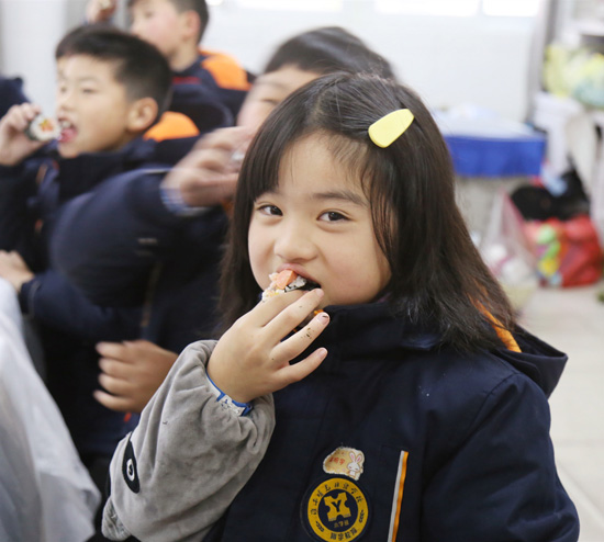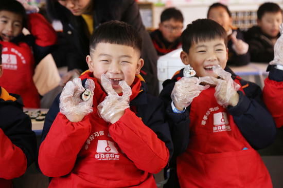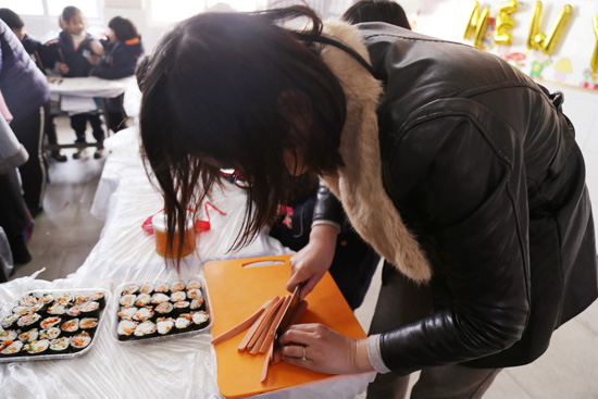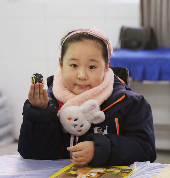 活动现场,场馆负责老师先向孩子们介绍了寿司的做法,随后为大家发放了各种食材,只见孩子们将海苔平放在竹帘上,匀称地铺上米饭,再加上胡萝卜条、黄瓜条、火腿肠、沙拉酱等,用竹帘慢慢裹紧,在裹的过程中,孩子们互相帮忙,一个个完整的寿司卷就做成了。晶莹剔透的米饭配上色彩鲜艳的食材组合到一起,这样美味可口的寿司呈现在面前,让人垂涎欲滴,孩子们对自己的劳动成果也是赞不绝口,纷纷开始亮出自己的作品。