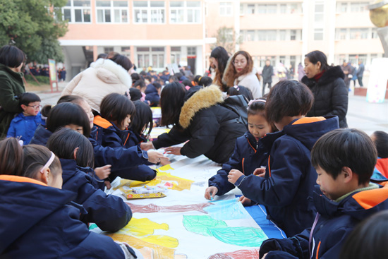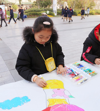 只见广场上一片生机盎然,孩子们在展开的百米长卷旁,选择自己喜爱的作画工具,有的用记号笔尽情挥洒,有的用彩笔涂鸦,有的用油画棒创意添画;他们以不同的姿态,用他们稚嫩的小手,兴高采烈地在画纸上描绘着幸福和梦想。