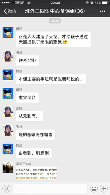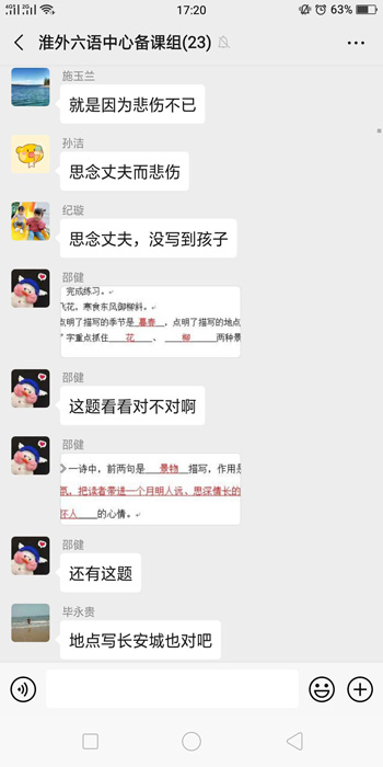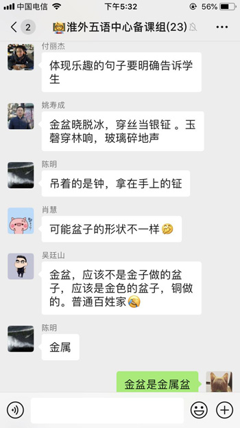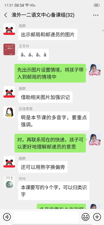 语文教学分管校长高海燕亲自部署安排,迅速在微信中成立了一到六年级语文中心备课组,以备课组为单位,每天下午二点半开始到三点半一个小时时间为语文集体备课时间。各年级的备课组组长迅速制定好授课计划,确定每天集体备课的中心发言人,其他备课组成员需全员参与,对第二天的授课内容进行补充发言。