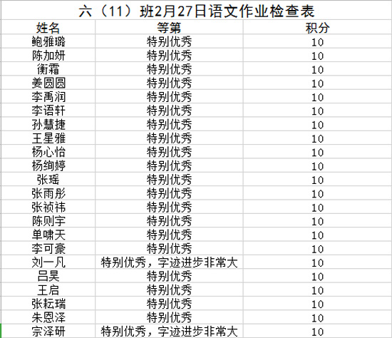 制定量化考核表。对于每个学生来说,老师上课时不经意的一个动作、一个肯定的眼神,一句鼓励性的话语,可能都会让他们在内心泛起阵阵涟漪。可是现在,我们和学生之间隔着一个屏幕的距离,该如何才能调动学生的学习积极性,让他们愿意自己主动去学呢?我们的做法是制定一份量检查表,针对每天的作业情况及时进行统计,每日一公布,孩子们的积极性有了明显的提高。