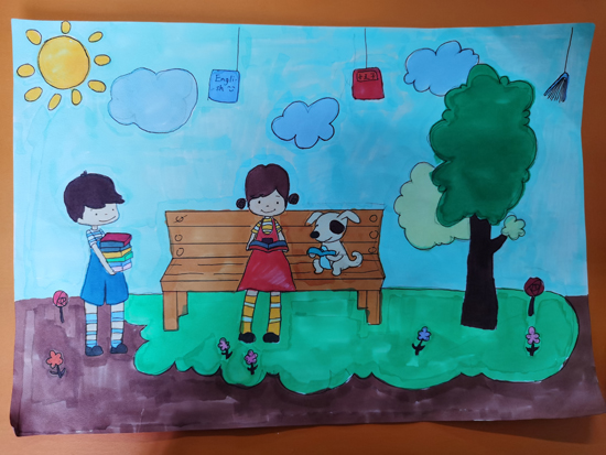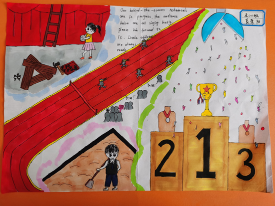 五年级的孩子们围绕我校四季八节中的读书节和艺术节展开了想象,他们设计了淘书乐,书橱布置,作家进校园,我们爱读书, 跳蚤市场,朗读竞赛,时装秀,幕后花絮,武术表演等场景。学生通过平时的观察,动手设计自己的绘本插画。孩子们发挥自己的想象力和创造力,使校本英语绘本变得更有乐趣。