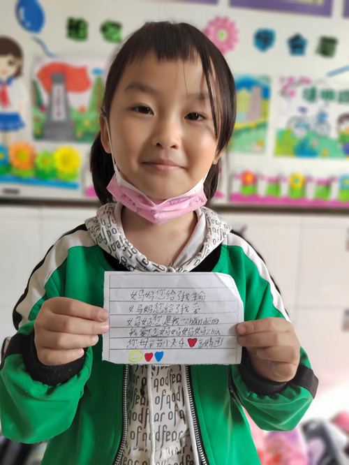爱要大声说出来,虽然不在妈妈身边,但老师们让孩子们通过诗朗诵、写贺卡、写感恩信等的方式向母亲表达感谢。“妈妈,我爱你!”“妈妈,节日快乐!”一句句温馨的祝福,一句句感动的话语,让爱与感恩轻轻流淌在孩子与妈妈之间。