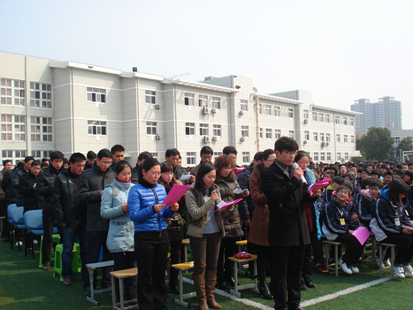杨柳依依,和风融融。14日下午,淮外初三年级1200余名师生齐聚绿茵足球场,隆重举行2012届中考百日冲刺誓师大会。大会由张明根主任主持。分管领导王奎生副校长以及部分家长代表参加活动。