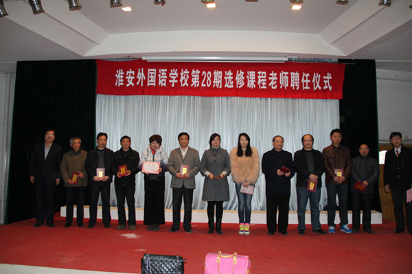 3月10日下午5点10分,淮安外国语学校举行第28期选修课教师聘任仪式。22位外聘专家学者教授和20位本校教师应邀参加聘任仪式,并欣然接受淮外朱建文校长、张宁生副校长颁发的聘书,任教淮外选修课。聘任仪式由教学教研处赵树青主任主持。