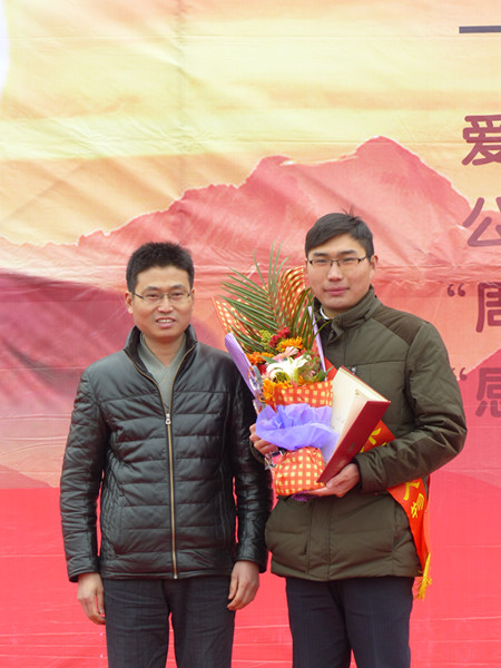 曹国柱副校长和“感动淮外”2014年度人物崔桂军老师合影