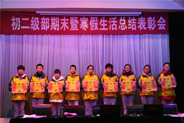 表彰先进,树立典型。田学银主任等领导分别宣读了寒假生活总结表彰决定。会议表彰了“孝星”先进个人、社会实践先进个人、寒假作业先进个人等一大批优秀学生。田学银主任、高君副主任、王大欢副主任等领导为获奖个人颁发了奖状。此次表彰大会还宣读了部分优秀的家长寄语,感谢家长在假期给予学校充分的配合。