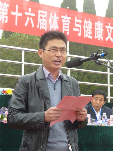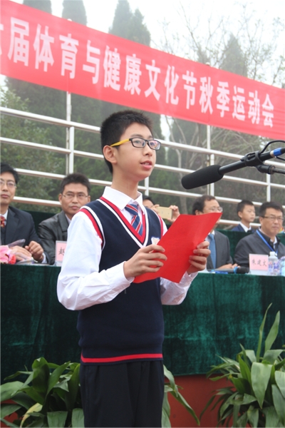 各个年级、班级的代表队、裁判员代表队在观众的呐喊声中闪亮登场。他们雄姿英发,肩并肩,昂首挺胸,给这绿茵场地注入了一股新鲜的血液。庄严的升旗仪式后,陆怀珍副校长致开幕辞,他说:“体育竞赛是一种用力来挥写,用美来传达,用速来超越,用度来衡量的运动形式,它传承的是人的个性化,体现的是人的成熟化,展现的是人的人格化。所以体育是教育事业的重要一环,发展体育事业,增强人民体质,是全面建设小康社会,促进人们全面发展的必然要求。这次的体育文化节不仅仅是一场场比赛,更是一个展示素质的平台,在这里既有体能和技巧的较量,也有道德素养的比拼。也是对同学们心理素质、身体素质、体育运动水平的一次验收,希望同学们在这个平台上一展身手,顽强拼搏,取得好成绩,为个人争光,为班级添彩。”
