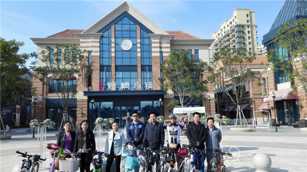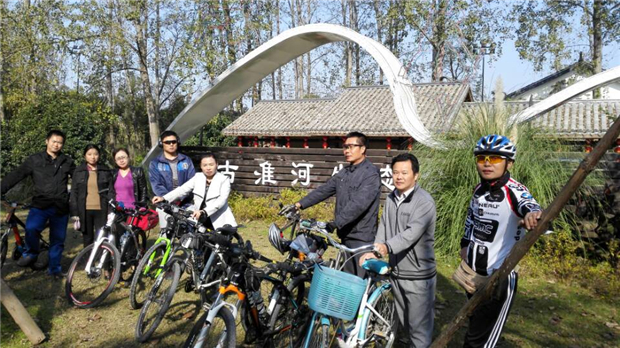 太阳渐高,行程渐远,骑行的队伍逐渐拉开了距离,张明根校长助理不时上前退后,给大家加油鼓劲:“坚持到底就是胜利!”餐厅厨师长徐捷将车载微型音响调至最大,用手机里的歌声激励大家:“最初的梦想紧握在手上,最想要去的地方,怎么能在半路就返航,最初的梦想绝对会到达,实现了真的渴望,才能够算到过了天堂……”途中,路过具有俄罗斯风情的爱情小镇,大家不约而同地停驻于此稍作休息,一边欣赏异国风情,一边合影拍照留念。随后,大家一鼓作气,直奔古淮河生态园。