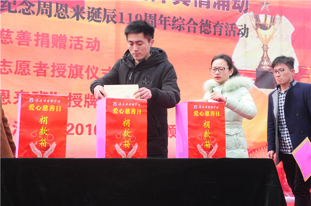 三月的春风送来了人们永远不能忘却的日子。今年的3月5日,是一代伟人周恩来诞辰119周年纪念日。为缅怀敬爱的周总理,领略一代伟人的情怀,弘扬学习革命先驱艰苦奋斗,自强不息的崇高精神,推动我校“学周”主题实践活动的深入开展,3月3日下午,淮安外国语学校隆重举行了主题为“缅怀总理千秋师表,感动淮外真情涌动”的纪念活动。“爱心捐赠”与“志愿者授旗”便是其中的两项活动。