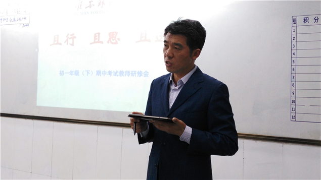 赵树青副校长以《重研究,重方法,提高师生的成长质量》为题,破解期中素质调研背后的密语。他说,期中过往,半学期的教育教学工作,教师们都付出了努力和坚守,他将初一工作的总策略概括为“重研究,重方法,提高成长质量;善于总结经验,实现持续进步;善于调适状态,实现主动进步”。面对现状,他认为善于反思是期中总结的最优策略。首先要反思学情,立足进步。学情分析,要注意从老师主导到学生主体。面对优秀生,他认为教师们要“启迪高远、引导得法、突出能力、及时点拨,立足鼓励自主”,面对学习暂时落后的学生,他提醒教师们要“投入情感、传递信任、强化毅力、过关及时,立足激发参与”。
