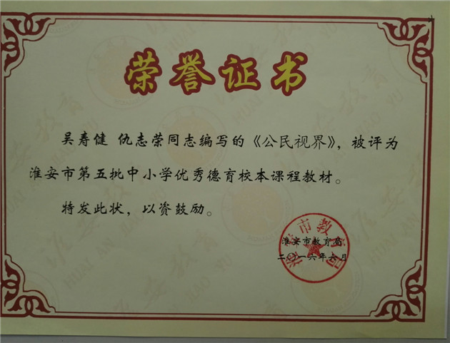 淮外编辑的公民教育读本《公民视界》于2016年获评淮安市第五批优秀德育校本课程教材。《公民视界》立足于学生思想道德品质的养成,关注初中阶段学生身心健康发展,关注和聚焦社会热点时事,开辟“新闻博览”“新闻时评”“热点透视”“文化博览”“走进社会”“心灵导航”“法伴我行”等栏目。一本《公民视界》在手,学生“家事、国事、天下事”都能有所知晓,同时也培养了学生的公民视野和认识事物的角度和深度。