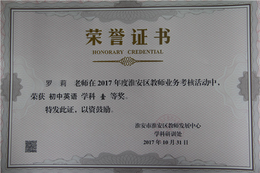 近日,从淮安区教师发展中心传来喜讯,淮外多名教师在2017年度淮安区教师业务考核活动中表现出色,受到表彰。吴寿健、罗莉、翟晓晓、翟佩龙、雍玮玮、孙连军、赵国武、王健等13位老师荣获壹等奖,程三宝、陈明海、朱银淼、章芝、张知双、闫婧、耿康等14位老师荣获贰等奖。祝贺获得表彰的各位老师。