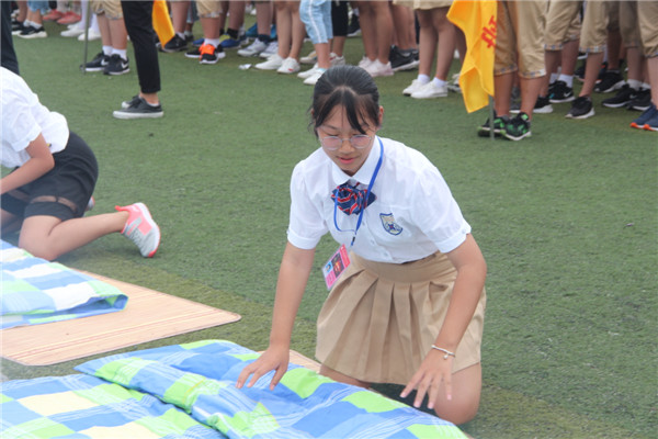 赛前,选手早已带好自己的比赛用品:一张席子、一床被子,在操场上做好准备。而班级同学在场边,时刻准备为选手们打气、加油。随着发令声响,第一组选手迅速蹲下,场边也响起了整齐响亮的加油声。一位胖胖的小男生先将被子均匀地分为三段,一层层叠成一个“长条”,再将“长条”仔细分成几等分,还未仔细瞧见他的细微动作,他已经在整理叠好的“豆腐块”的边角,动作敏捷迅速,足见其熟练。
