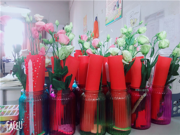 水晶瓶里的鲜花静静吐露芬芳,一封封用红纸写就的信,被小心地扎上蝴蝶结,在初一每个班级的桌上静默着,等待着夜晚的来临。从早上开始,初一老师就陆续收到班主任的邀请,着手写一封有关“想你们说”的信给孩子们。英语组的李秋慈老师更是有了一种“爱的烦恼”:“我是用英文写呢?还是用中文写呢?嘿,不想太多了,只要发自肺腑,都可以。”