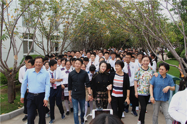 上午11点,朱建文校长便携级部各领导在校门口等待嘉宾的到来,淮外学子手持花朵夹道欢迎,校园张灯结彩,热闹非凡。