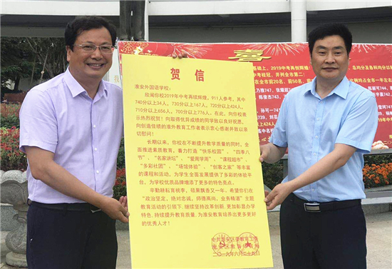 辛勤耕耘育桃李,硕果飘香又一年。2019年中考淮安外国语学校再续辉煌。6月29日上午,淮安区人民政府副区长谈效艳、区委教育工委书记、区教体局局长房乃发代表区委区政府和区教体局专程来淮外致贺。区教体局副局长、区教师发展中心主任高云海、区教体局党委委员武龙宝、区教体局宣传科长于兆文,淮安华石集团党支部书记倪萍、副总经理张建国陪同。翔宇教育集团副总校长、淮安总校总校长、淮安外国语学校校长朱建文、副校长曹国柱、张明根、张知双热情接待各位领导。