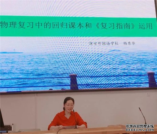 研讨活动上,淮安区骨干教师、物理兼职教研员杨秀华老师开设《中考物理复习中的回归课本和<复习指南>运用》讲座,结合学生作业图片以及复习课实例解说,分享淮安外国语学校的具体做法。