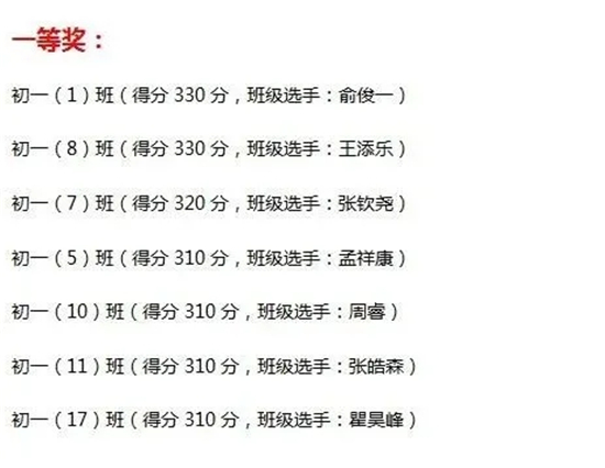 比赛结束后,经过现场积分统计,比赛结果新鲜出炉。初一(13)班、初一(15)班等班级荣获特等奖;初一(1)班、初一(17)班等班级荣获一等奖;初一(12)班、初一(6)班等班级荣获二等奖。校长助理张三平、初一级部王健主任和王大欢副主任分别为获得特等奖、一等奖和二等奖班级颁奖并与之合影留恋。