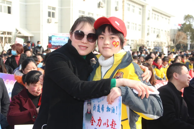 祝福感恩,殷切期盼。在刘杰老师的深情主持中,家长们登场寄语送祝福,把本次活动推向一个小高潮。“蟾宫折桂,独占鳌头,勇闯雄关,誓破楼兰”、“静心复习,精心琢磨,细心答题,开心迎考”、“用青春的热血,沸腾人生的灿烂。”……他们带着自己精心设计的标语和手举牌在舞台上大声宣读着自己的誓言,为孩子们加油鼓劲。家长们的话语,让学子们心生温暖,动力无穷!当熟悉的旋律“时间都去哪儿了”响起时,同学们与自己的父母紧紧相拥,感动的泪水溢满眼眶。这一刻,运动场上幻化成了爱的海洋,爱的潮水波涛汹涌。我们相信同学们一定会带着父母的祝福,越过山丘,享受到最美的风景!