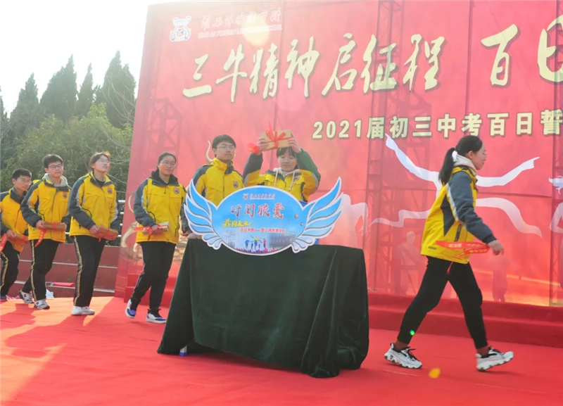 畅想未来,激情宣誓。聆听完家长和老师的寄语,18个班的班长依次上台,将由同学们亲笔书写的《致100天后的我》信札放进“时光胶囊”,由中考后的自己亲自拆封,去畅想、收获自己的梦想。在主持人的带领下,初三全体同学起立宣誓:“不负父母的期盼,不负恩师的厚望,我要超越自我,我要卓立巅峰,生命如虹,青春不悔!”宣誓声,此起彼伏,响彻苍穹。