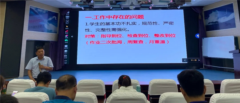 张明根副校长从“工作中存在的不足、责任心与工作能力”两个方面出发,对本阶段的教学方向和质量进行了深刻的反思,并提出了相关对策。他提醒教师要重点整改作业学案;关注不同层次学生的需求;重视课堂的生成性问题;重视学生小组合作学习;明确学习任务;提高双案的质量。教师要做到守土有责、守土负责、守土尽责;不断提高自己的工作能力,及时总结反思教学成果。最后,张校长就“近期核心工作”提出自己的建议,即扎实推进高效课堂;精心编制暑假学习材料;关注教育安全;及时进行学情分析。