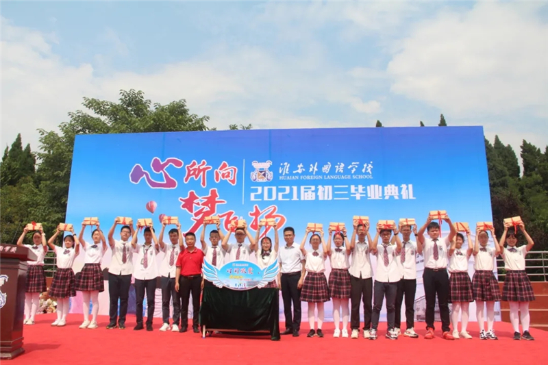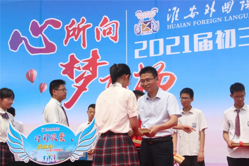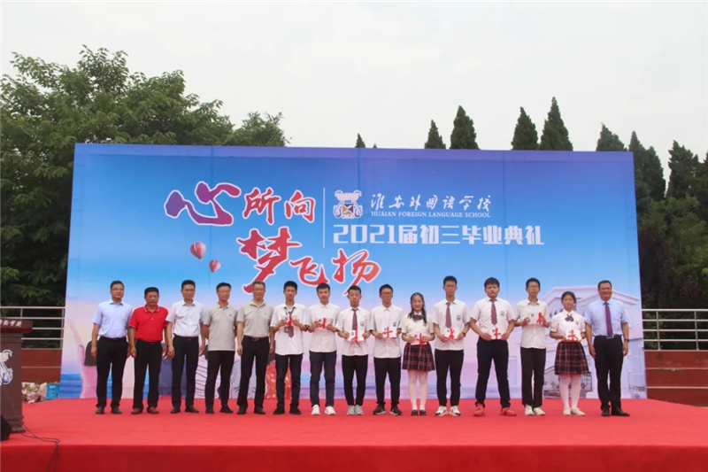 颁发证书,梦想启航。毕业是天各一方的分别,是带着新的希望启程。淮外三年,多少精彩的青春故事在这片土地上演绎。初三级部分管领导陆怀珍副校长宣布淮安外国语学校2021届(2018级)校友会成立,并宣读各校友会主要负责人名单。随后,朱总校长,常务校长曹国柱、王奎生副校长、陆怀珍副校长、张明根副校长等领导为初三学生颁发毕业证书,初三18个班的班长上台领取毕业证书。