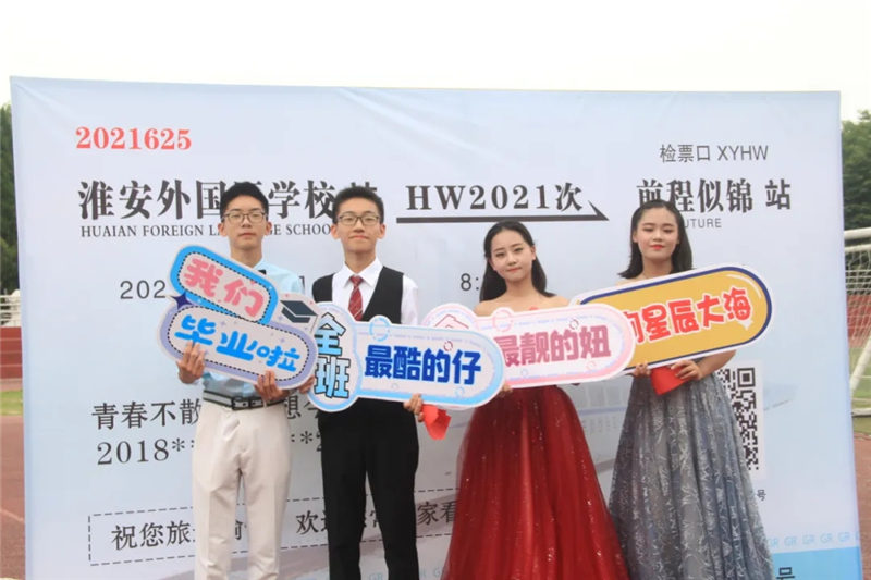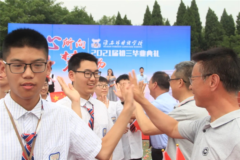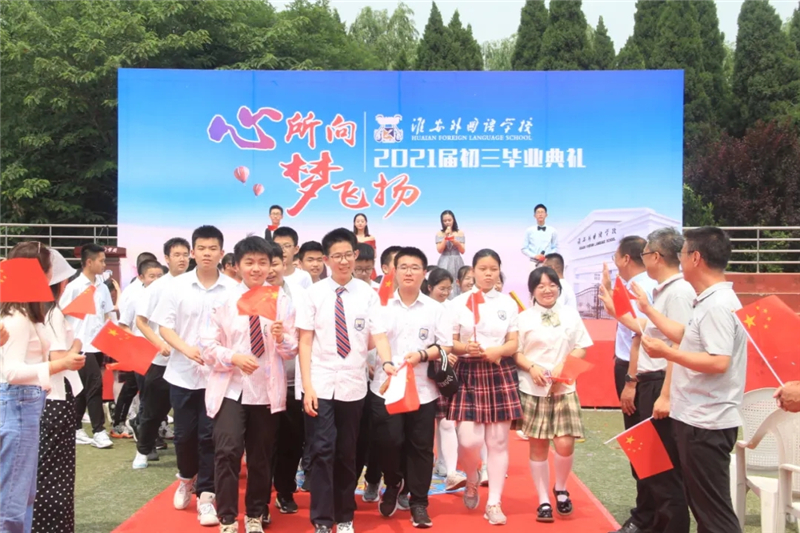 歌唱祖国,铭记深情。典礼最后,淮外2021届毕业生们手举国旗,高唱《我和我的祖国》,随后列队通过铺着红地毯的毕业大道,走过“成功门”,接受母校、恩师和家长的祝福与送别,接受家长与学弟学妹的期盼与希冀,走向更美好灿烂的明天。难忘的毕业典礼,是淮外为毕业生们送上的一份特别的礼物。我们相信,淮外2021届毕业生们必会秉承“以少年恩来作典范,为中华崛起而读书”的校训,知使命,担责任,懂坚守,有勇毅,学真本事,做顶天立地的栋梁之材!