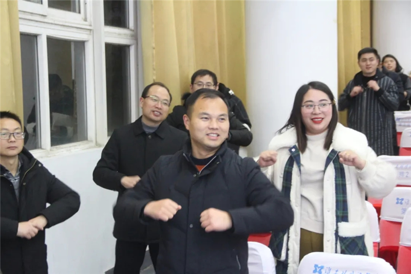 会议在贝多芬《d小调第九交响曲》激昂奋进的曲调中拉开帷幕,作品中讴歌全人类团结有爱的歌声和胜利的欢呼让与会老师感受到了音乐的魅力。随后,德育宣传处张艳副主任和徐娟老师带领全体教职工在欢快的节拍中放松身心,舒缓筋骨,让本次会议在愉悦欢快的氛围中进行。