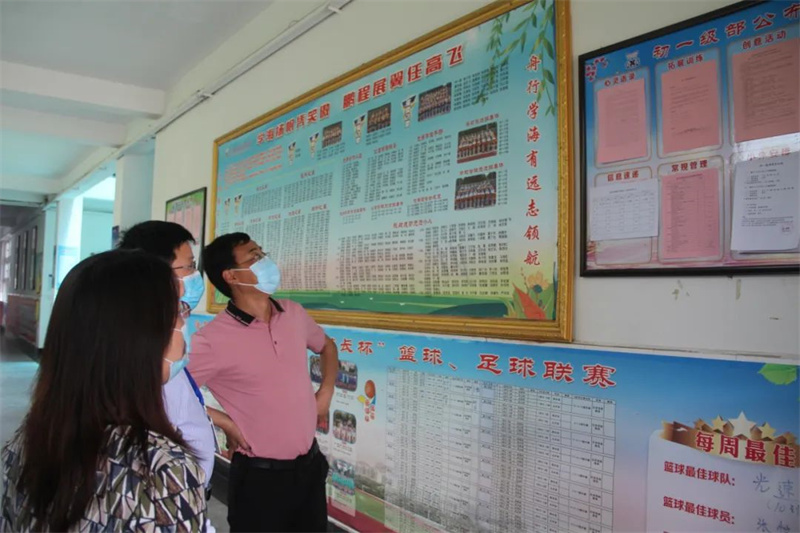 督导组一行对淮外师生代表进行了“双减”工作问卷调查;查看了各年级作业公示的详细情况;对餐厅食品的进货渠道、食品加工途径、食品保存方法、食品取样留存等各环节进行了详细的询问和检查,并就夏季食品的保存提出了指导性建议;督导组还检查了淮外学生心理健康方面的台账,了解了心理健康教师的配备情况。