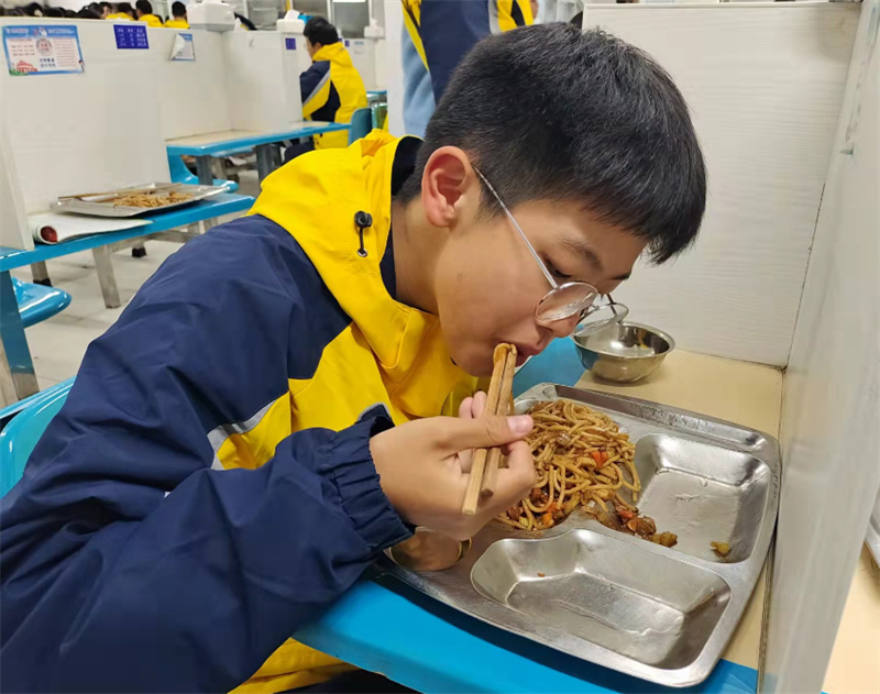 “天啦,今天食堂居然提供意大利面和鸡汤!我可得好好尝一尝。”下课铃声一响,初一年级的运动小将们便整齐有序地快步走到食堂,在排队小读的同时,还不停的向前张望着,肯定在想什么时候能到自己呢。面和鸡汤一打到手,同学们便坐在自己的座位上,狼吞虎咽起来。不一会儿便“风卷残云”,吃了个底朝天。好就好在可以二次、三次续面,同学们大饱口福,一边吃着新鲜的意大利面,一边喝着滋补的鸡汤,岂不乐哉?班主任老师们拍摄了许多同学们认真品尝美食“意犹未尽”的照片,将这样的幸福与家长一道分享,浓情暖意溢满了整个屏幕。