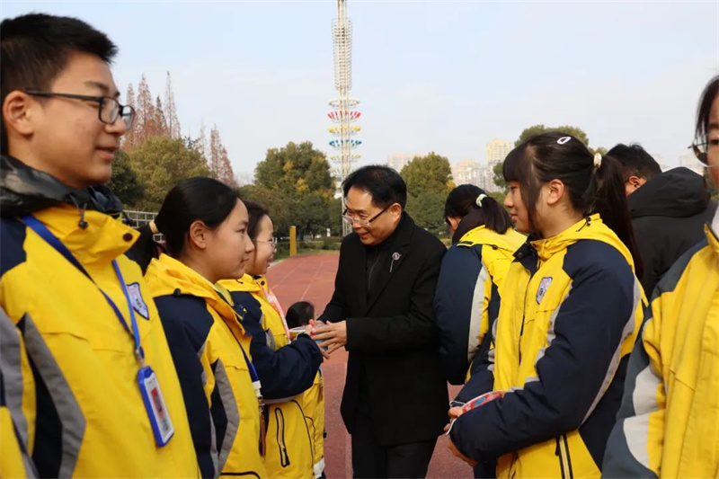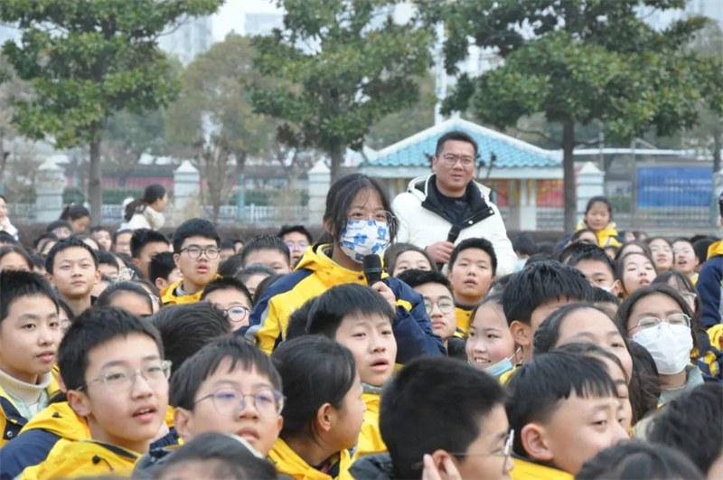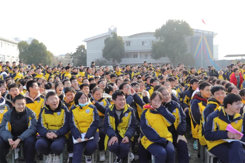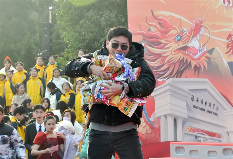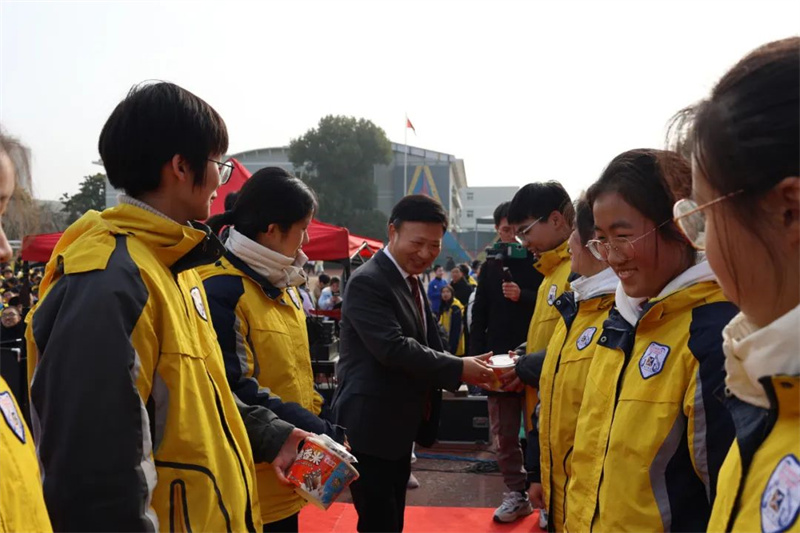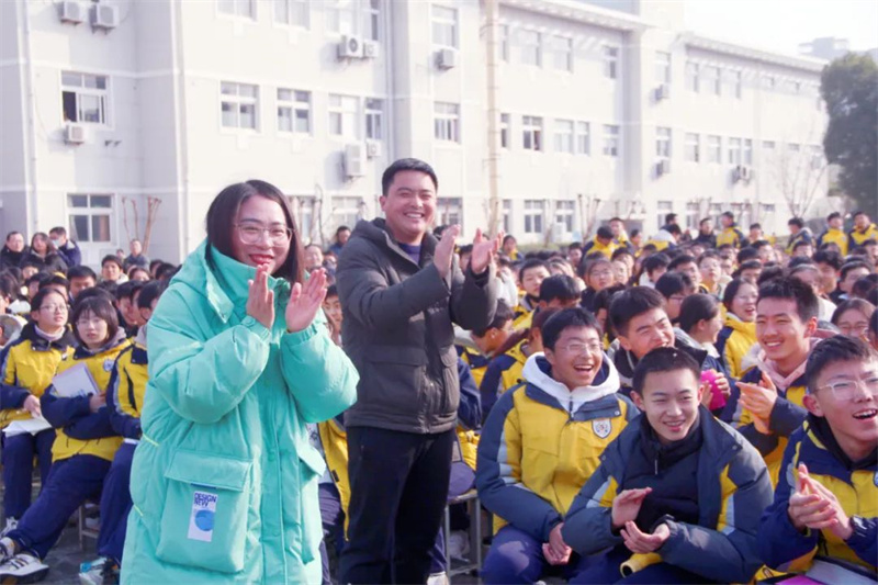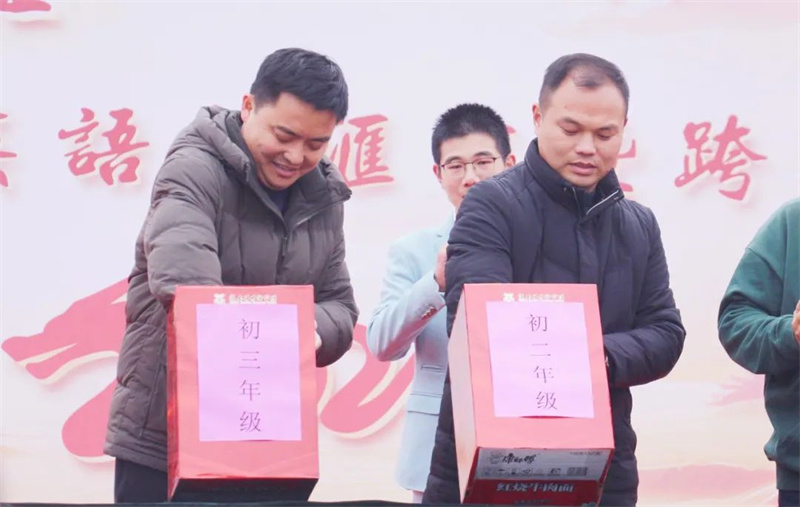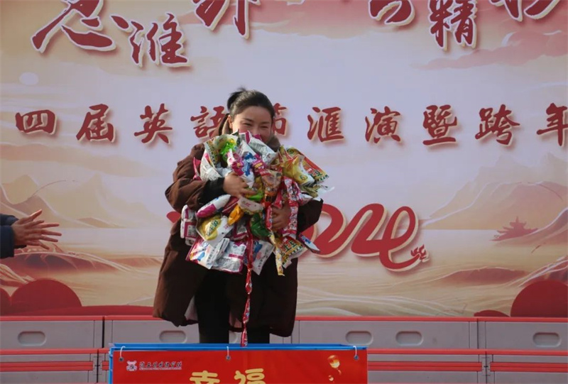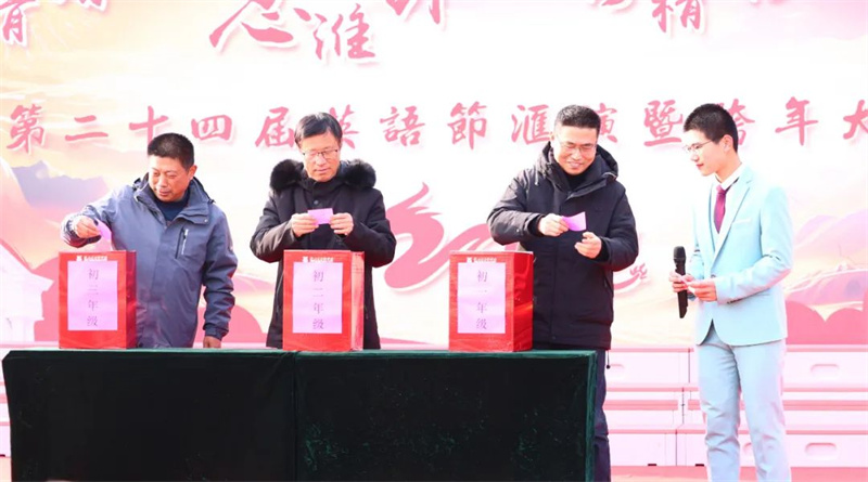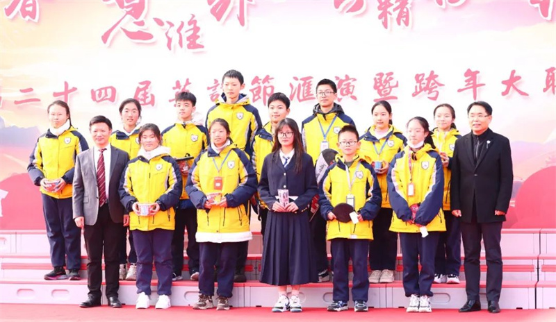 在表演的过程中,激动人心的抽奖环节终于开始。早在几天前,学校便已经让同学们写好自己的心愿卡,以等待今日的幸运降临。第一轮的抽奖由初一级部的夏培权主任、初二级部的耿康副校长以及初三级部的张虎城主任现场抽取,同学们的愿望简单朴素,文具、巧克力成为热门。第二轮的抽奖则由初一级部的陆怀珍副校长、初二级部的王奎生副校长以及初三级部的张明根副校长抽取,又一批幸运儿产生,有的如愿以偿获得了自己想要的文具用品,有的收获了糖果的甜蜜,还有的祝愿家人和朋友在新年健康快乐,也有的寄托了自己对未来的期盼……卢志文总校长、高立顺总校长及常务校长曹国柱为幸运学生颁奖。