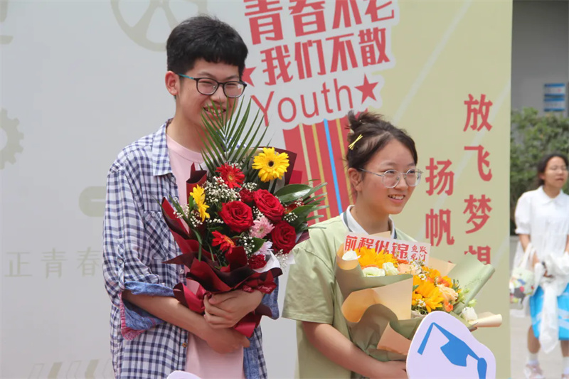 桃李芬芳,教泽绵长。“无论再过多少年,无论我们走到哪里,淮外的老师永远都是我们最温暖的回忆。”在主持人动情的讲话声中,16位学生代表为班主任老师献上祝福的鲜花和温暖的拥抱,表达对青春路上摆渡人的感激之情。初三级部主任张虎城作为班主任代表发言:“三年来,同学们在砥砺勤学中羽翼渐丰,在扎实学识中睿智成熟,不觉此间,拼搏已点染生命之花,执着已点亮满眼繁星。那些光影跌宕的场景,热血沸腾的片段,都停泊在最美好的记忆中。祝贺所有孩子们圆满地完成了初中三年的学业,山水万程,皆要好运!”