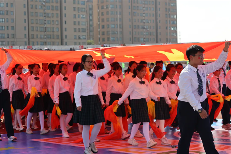 在激昂澎湃的运动员进行曲中,国旗、校旗方阵气宇轩昂地走来,他们步伐刚劲有力,身姿挺拔如松,手中的国旗与校旗在阳光下熠熠生辉,如同闪耀的希望之星。紧接其后的会徽吉祥物方阵,那可爱萌动的吉祥物和独具创意的会徽,瞬间吸引了众人的目光,展示着本次运动会的别样魅力。鲜花方阵与彩旗方阵则似绚丽的彩云和灵动的旗帜,为开幕式增添了一抹无比亮丽的风景。各级部方阵更是各具特色,他们口号嘹亮震天,服装整齐划一,充分展现出各年级的独特风采与蓬勃活力。