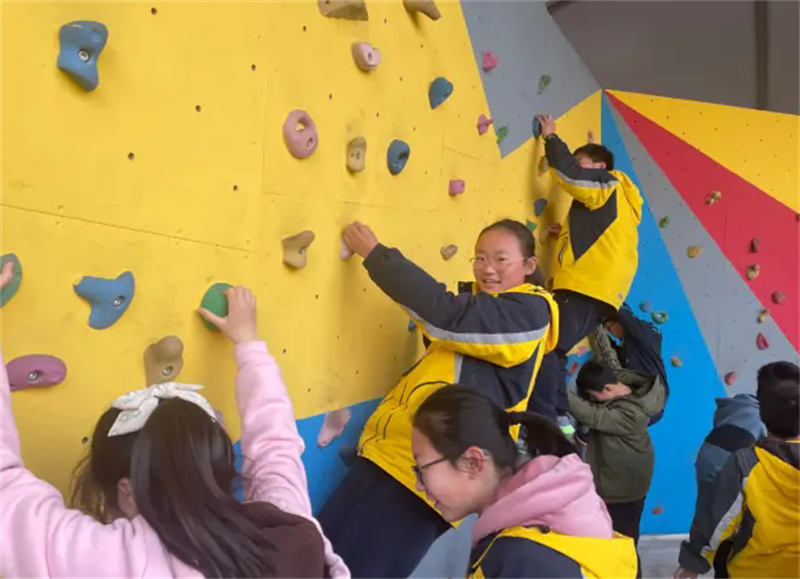 当大课间的铃声响起,整个校园瞬间热闹起来。攀岩场地无疑是勇者的舞台,同学们身姿矫健,目光坚定,双手紧紧抓住攀岩点,双脚沉稳地发力,一步一步向着顶端攀登。有的同学如壁虎般灵活,迅速而流畅地向上攀爬;有的同学虽略显吃力,但眼中的坚毅从未动摇,在同伴的加油声中咬牙坚持,这种坚韧不拔的毅力和勇于挑战的精神在攀岩的过程中体现得淋漓尽致。