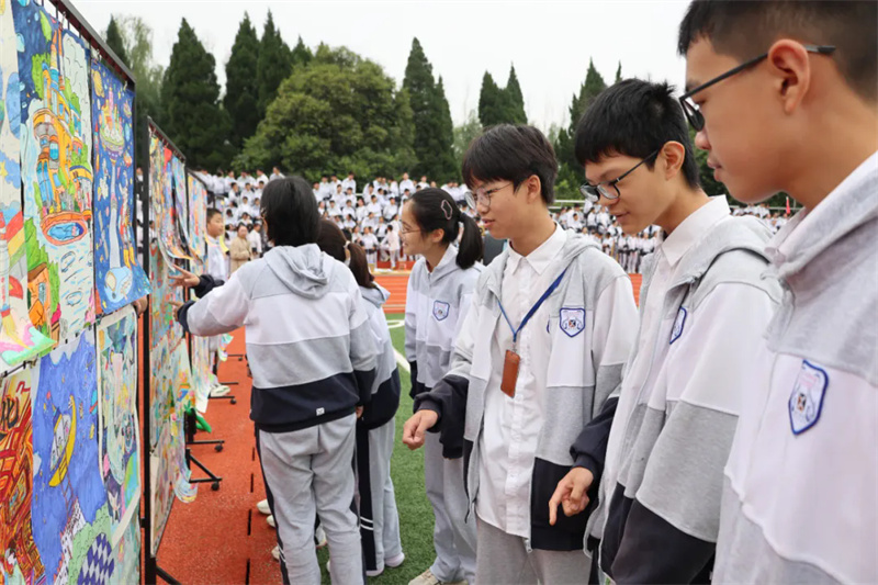 田径场的四周,是初一年级和初二年级各班级精心布置的科技作品展区。这里汇聚了同学们平日里的奇思妙想:构思精巧的科学幻想画、内容丰富的科普海报,以及各式各样充满巧思的科技小制作、小发明作品琳琅满目。