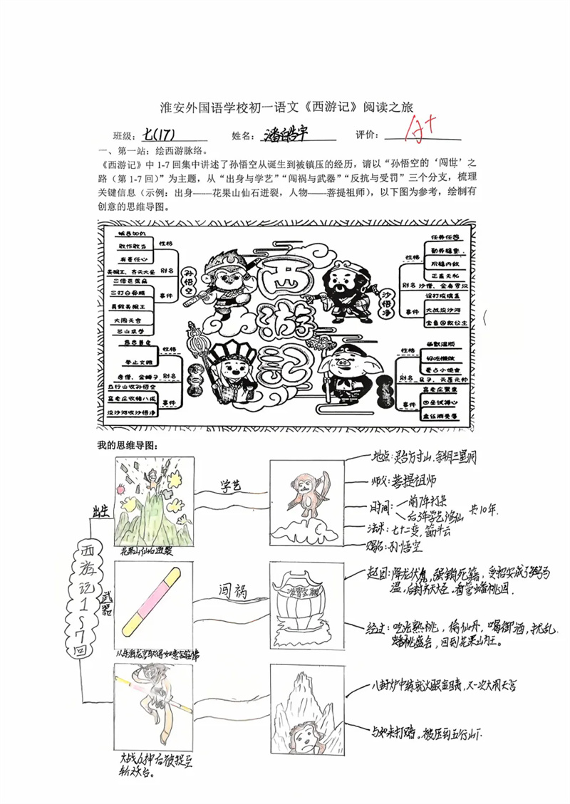 在刚刚结束的国庆假期,淮安外国语学校的同学们并未沉浸在题海之中,而是收获了一份充满弹性与创意的阅读实践作业。学校鼓励学生阅读《西游记》、《朝花夕拾》等经典读本,通过完成“思维导图”或传统“读书摘录”的方式,记录自己的阅读轨迹,展示独特的阅读思考。这一举措让阅读成果的展现形式更加多元化。
