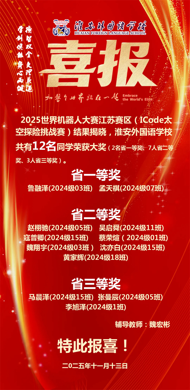 晚秋的淮外校园生意盎然,捷报频传。在刚刚落幕的2025世界机器人大赛江苏省选拔赛(ICode太空探险挑战赛)中,淮安外国语学校学子表现突出,斩获优异成绩。根据大赛通知文件中奖项比例计算,淮外共有12名同学获奖,其中有2名同学荣获省一等奖,7人获省二等奖,3人获省三等奖。获奖层次和获奖人数均居淮安市初中第一。