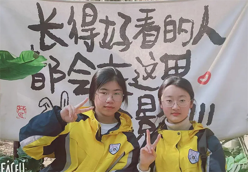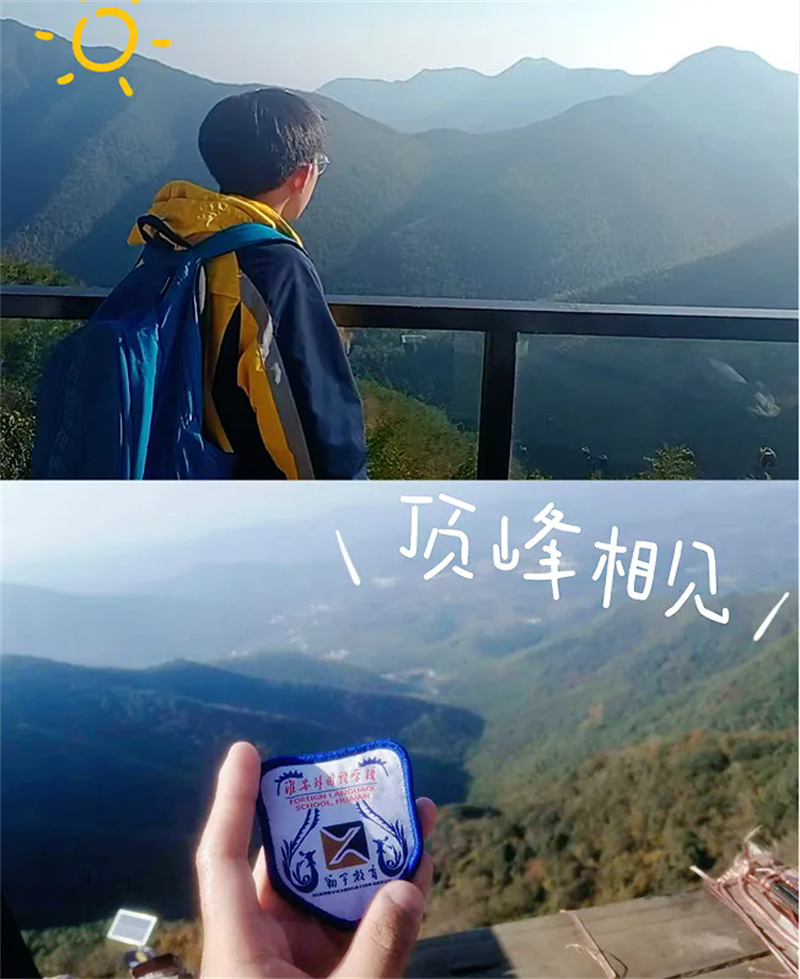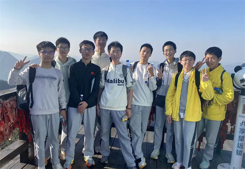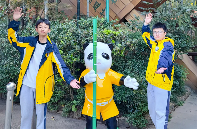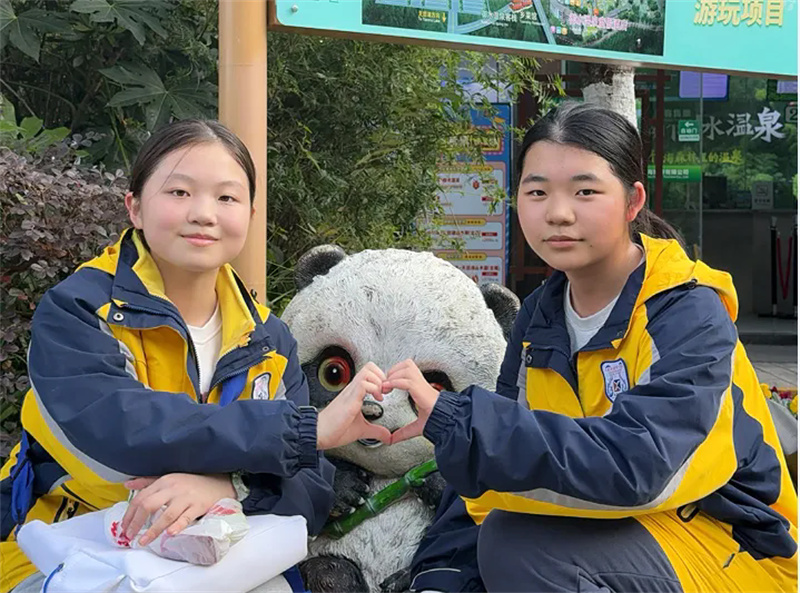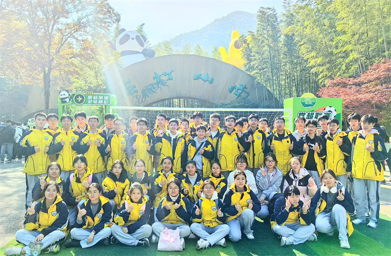 中午十二点许,队伍乘车前往南山竹海。刚入景区,便见路旁修竹挺拔、苍劲有力,山间云雾缭绕,宛如“白云回望合,青霭入看无”的诗画意境。学子们拾阶而上、结伴同行,向着山顶稳步迈进。置身于“咬定青山不放松,立根原在破岩中”的茫茫竹海,喧嚣渐远,内心满是宁静。对于毕业班的孩子们而言,攀登的过程既是对体力的考验,更是对意志的锤炼,每一步都凝聚着克服困难的勇气与信心。当登上山顶,“山登绝顶我为峰”的豪情油然而生,背后苍翠欲滴的竹林与云雾缭绕的群峰相映成趣,让孩子们胸怀愈发壮阔,斗志更加昂扬。山顶的大熊猫“华丽”与“星安”憨态可掬,深受孩子们喜爱,大家纷纷拍照打卡,主动收集大熊猫的生活习性与保护知识,在互动中体悟人与自然和谐共生的真谛,实现了科普教育的潜移默化。