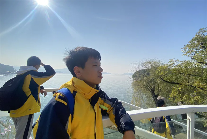 上午九点半,研学队伍抵达天目湖景区,澄澈的湖水与和煦的阳光相映成趣,宜人的景色让孩子们瞬间卸下了学业的疲惫。在老师的有序带领下,大家首先走进海洋馆,五彩斑斓的鱼类穿梭往来,体型硕大的海龟悠然游弋,柔美灵动的水母翩翩起舞,奇妙的海洋世界让孩子们目不暇接,纷纷驻足观察、提笔记录。湖边工作人员还详细介绍了天目湖鳙鱼的生态养殖技术,以及其承载的“年年丰收”的美好寓意,让孩子们在欣赏美景的同时,收获了实用的科普知识。随后,学子们或乘游船登岛揽胜,感受湖光山色的静谧;或走进茶文化体验馆,细品清雅茶香,体悟传统茶文化的韵味。初三语文组张诚老师凭栏远眺,即兴吟出“临斯湖也,让人心旷神怡,宠辱偕忘……”天目湖的灵秀风光与深厚底蕴,正潜移默化地滋润着每一位学子的心灵。