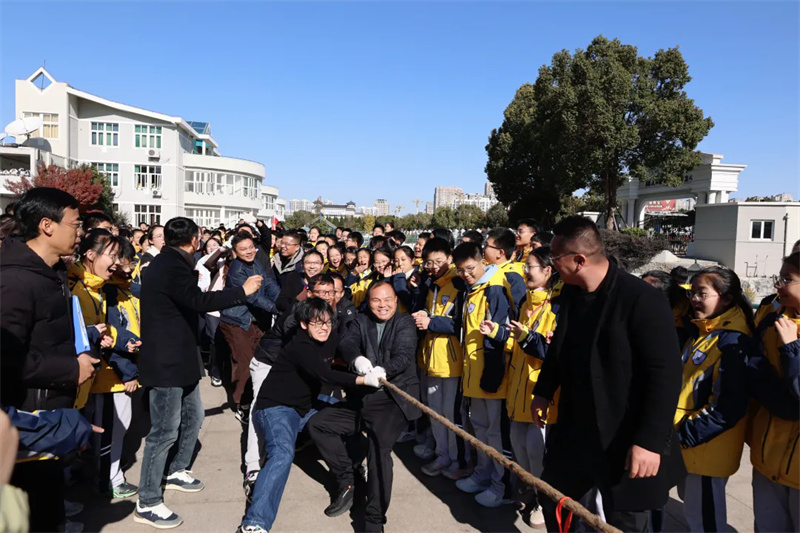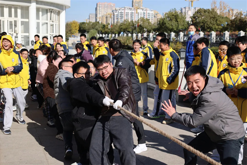 作为开幕后的首场焦点之战,拔河比赛在铜像广场激情上演。对阵双方分为两大组:初三年级组对阵总后勤部,初二年级组对阵初一年级组。赛场上,队员们紧握长绳,扎稳马步,身体后倾;场边,学生、老师和职工们组成的啦啦队呐喊助威,声浪震天。经过数轮紧张激烈的胶着对抗与力量比拼,初二年级组凭借出色的团队配合与战术执行,一路过关斩将,最终勇夺冠军!总后勤部荣获亚军,初三年级组与初一年级组分列三、四名。