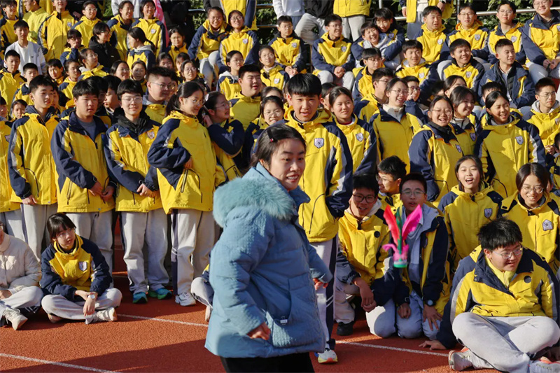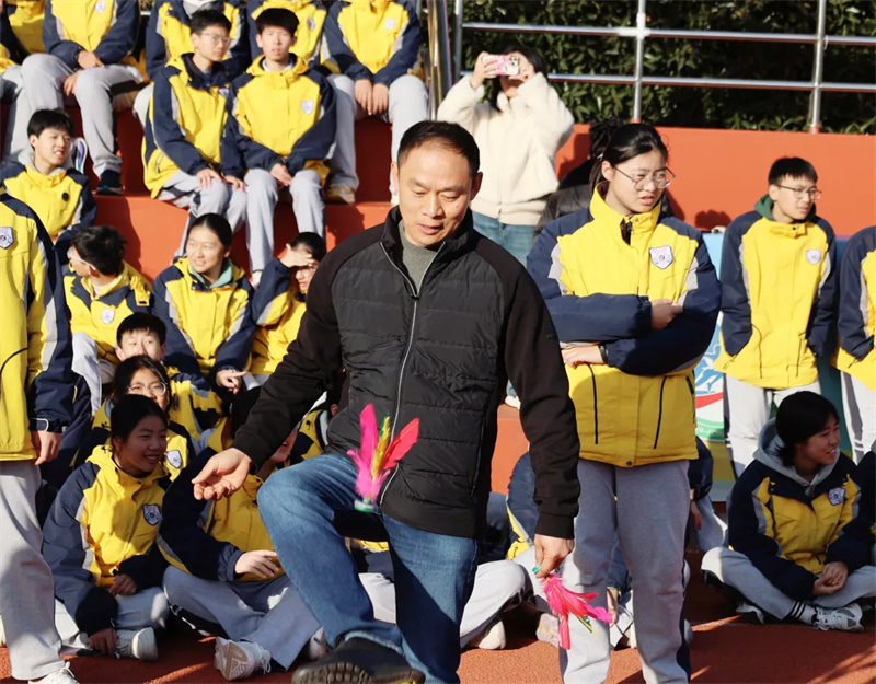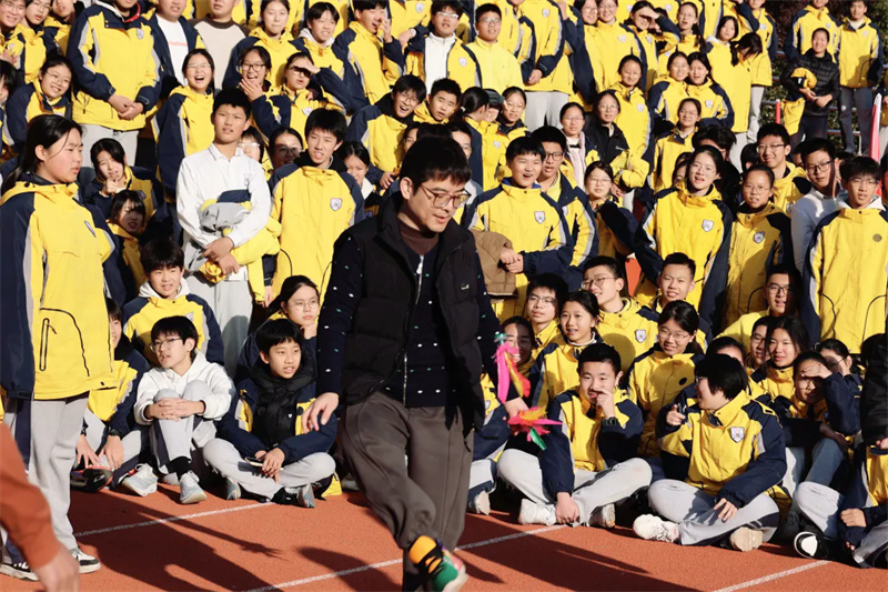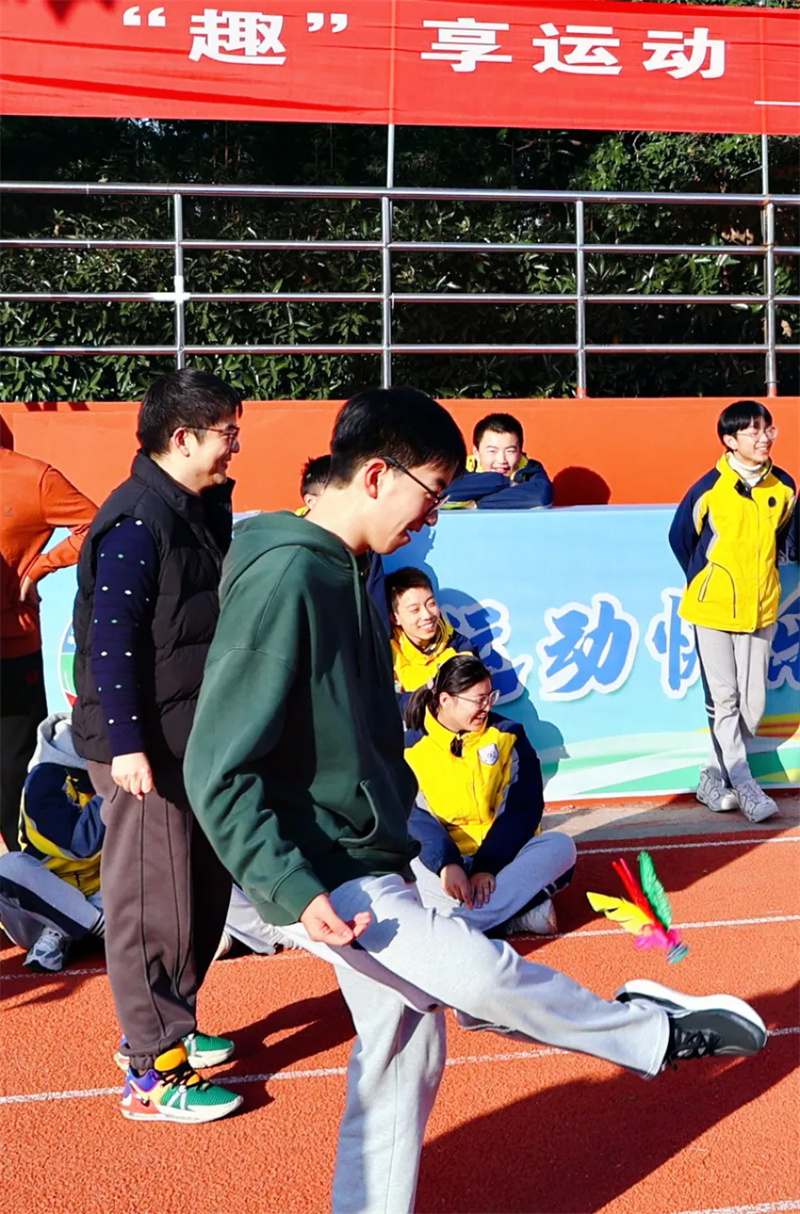 率先进行的是踢毽子比赛。裁判一声令下,五彩的毽子瞬间在空中划出纷繁的弧线。老教师们气定神闲,脚尖、脚侧轮番上阵,毽子如同被施了魔法般稳稳起落;年轻教师则活力四射,不时穿插高难度的背后勾踢、转身跳跃。教师之间,师生之间还玩起了花式踢法,引得场边观战的学生们阵阵惊呼。场边,各班学生围得水泄不通,呐喊声、计数声、欢笑声此起彼伏:“鲁老师加油!”“语文组最棒!”热烈的声浪将冬日的寒意驱散得一干二净。