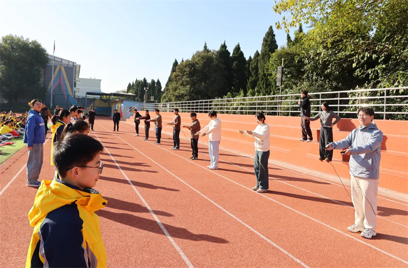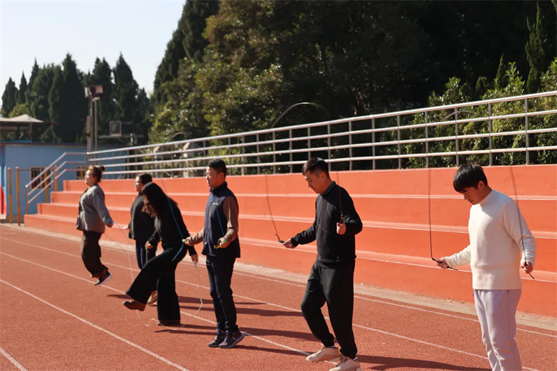 踢毽比赛的余温尚未散去,紧接着的个人跳绳比赛瞬间将赛场节奏推向高潮。哨声再次响彻操场,只见一根根短绳立刻被舞得呼呼生风。女教师们身轻如燕,双脚轮换、单脚跳、双摇跳,花样百出,绳子在脚下化作一道道看不清的虚影;男教师们则力量与速度兼备,每一次起落都铿锵有力,尽显阳刚之美。此时,场下的学生们更是激情澎湃,齐声为各自敬爱的老师计数助威:“58,59,60……老师加油!破百!破百!”激昂的计数声与欢呼声汇成一片,响彻云霄。
