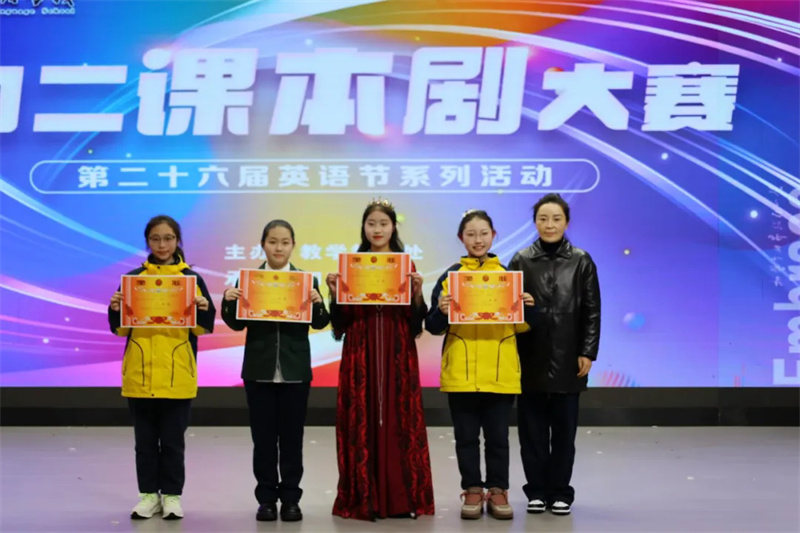 经过教师评委和学生大众评审公正评定,大赛最终评选出特等奖4名、一等奖7名、二等奖8名。每一份荣誉背后,是团队协作中的磨合与成长,更是将语言知识转化为艺术表达的勇敢尝试。李文婷副校长,夏文杰主任,韩彩霞主任,罗莉组长为获奖班级颁奖。