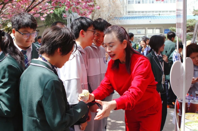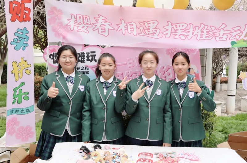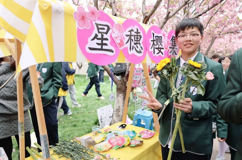 适逢樱花盛开,初一年级学生在樱花大道摆起“樱花市集”。美食、文创、玩具等摊位吸引师生驻足,同学们在真实的劳动与交易中锻炼沟通、协作能力,体验付出与收获的快乐。活动现场,孩子们与董事长王阿姨一同开心游戏、快乐互动,王阿姨还免费请孩子们品尝糕点和果汁等美食。