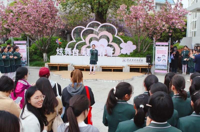 那边,“炫舞台”上正上演着春日文艺盛宴。男生舞团一曲Sorry节奏酷飒,女生小组深情演唱《至少还有你》温柔动人。樱花树下,舞台光影之间,每个孩子都是自带光芒的主角!